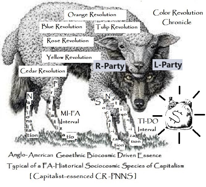 11 Although well-planned imperialism and hegemonism of our contemporary era and has been successful in wreaking havoc to the Soviet Union and certain disobedient capitalist slave-nations, color revolutions are reactionary revolutions to restore a previous political economic system, though unlikely to succeed, there are only used for weakening a political economic systems for wealth extraction purposes by the colonialistic-essenced, the imperialistic-essenced and the hegemonistic-essenced nations and nation-blocs. Between the FA-Historical Sociocosmic Species of Capitalism and the SO-Historical Sociocosmic Species of Socialism, the descending revolutions of the polar FA-SO-LA-TI aberration are the color revolutions (CR-PNNS). The ultimate goal of a color revolution is a wolf-in-sheepskin attempt to wreak an existing political economic system for the exploitation of both natural and human resources for private individualistic in favor of an exploitative capitalistic-essenced political system. The purpose of a wolf-in-sheepskin neoliberalism or FRJES-PNNS is to engineer color revolutions and has shown some beneficial destructive results and gains but somehow the wolves were discovered hidden under the sheepskin, later color revolutions could not take off. The purpose of wolf-in-sheepskin pseudo-neosocialism or capitalistic-essenced HEGRNS-PNNS is also the same but this is not experimented in the form of revolutions but rather in the form of economic manipulation, advertisements, promotions and price inflating by the capitalists, and shifting waste pollution costs and liabilities to the general public or to the slave-nations. The purpose of the LGBTQIA(+) - PNNS is to make for political mileage, securing more votes, having more 'says' and challenging existing social order typical of a FA-Historical Sociocosmic Species of Capitalism.