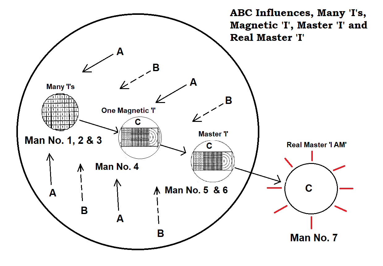 Man is born Man No. 1, 2 & 3 with many 'I's and 'it's and has no master 'I'.  Man No. 1 has active instinct-moving-sex centers, Man No. 2 has active lower feeling center and man No. 3  has active lower thinking center.  Man No. 4 is a transition man who works on himself to balance his fragmented instinctive-moving-sex centers, his lower feeling center and his lower thinking center and acquires a magnetic steward direction due to ingesting of a very strong 'magnetic' impressions from the chaotic outer world, some of which have been deliberately left over as B-influenced objective artifacts /sculptures/buildings/arts and subjective books/songs/music by the previously higher men No. 7s or C-influencer emanating individuals in history.  He has one and/or two magnetic center(s) and is a transition man without his own Master 'I'.  Man No. 5 is higher feeling center active and Man No. 6 is higher thinking center active and both have stable Master 'I'.  However, only Man No. 7 has all the centers active and stable at a higher degree of completeness as well as having a very high level of being.  He has the Real Master 'I' and therefore is a real biocosmic superman in the objective sense.  Except for Man No. 7 who is a C-influencer himself, all other man numbers are under A, B & C influences within the circle of ordinary life and in the circle of the Confusion of the Tongue - only Man No. 7 remains outside of this Circle of the Confusion of the Tongue.